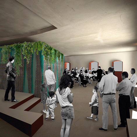 El proyecto propone para este espacio contenedor de una diversidad de usos vinculados al mundo de la música (aulas de música, estudio de grabación, salas de ensayo, espacios polivalentes...) un edificio que destaca su geometría y estructura como principal característica a través de crear un perímetro transparente y un patio central ajardinado que actúa como pulmón energético del conjunto, creando un efecto chimenea en verano y efecto invernadero en invierno.