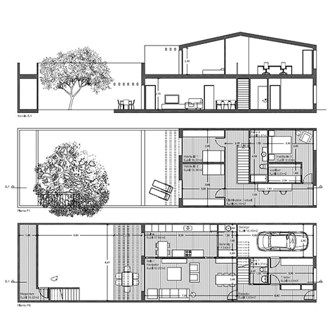Se propone relacionar con la calle un garaje y un pequeño local, mientras que se vinculan las zonas de estar al patio posterior que además recibe la mejor orientación del sol. Las habitaciones ocuparan la primera planta.