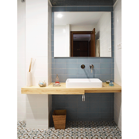 En el baño como en el lavabo se han utilizado suelos hidráulicos combinados con alicatados porcelánicos, generando a su vez contrastes y similitudes de tonalidad. Las habitaciones están pintadas puntualmente con verdes vistosos, combinados con el pavimento de parqué laminado y las otras paredes y techos en blanco. De esta forma se ha remodelado una parte de este piso a las nuevas necesidades manteniendo una estética moderna y funcional.