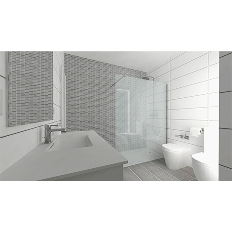 Así pues, siguiendo las indicaciones de los propietarios, se propone un baño con tonos blancos para dar el máximo de claridad en el espacio. Sin embargo, el pavimento y la pared del fondo se les da toques más oscuros para que contrasten el resto de paredes y el mobiliario. Por último, la bañera se sustituye por una ducha hecha en obra.