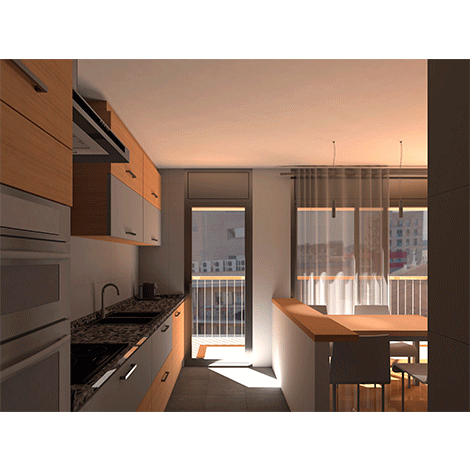 El proyecto interviene sobre la sala de estar y la cocina. Actualmente se encuentran en dos espacios diferentes y se propone el derribo parcial de un tabique para convertirlo en un solo espacio.