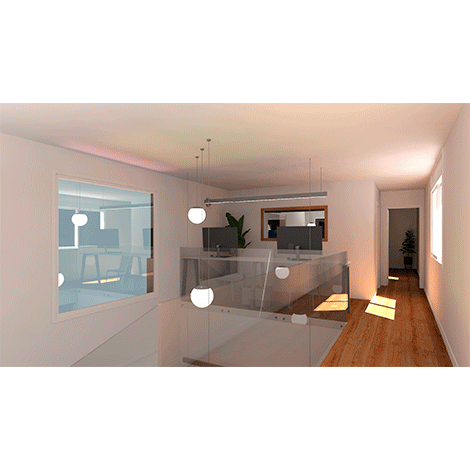 Para poder acceder a la nueva planta, se instala una nueva escalera que, además, dotará a la casa de un doble espacio que conectará el estudio actual con el nuevo.